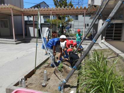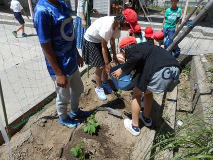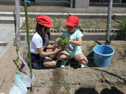 教室内で育てていたツルレイシが成長して大きくなりました。今日は,放課に学年花壇に定植しました。これからは学年花壇で育てていきます。下駄箱の近くなので成長がすぐに見ることできますね。気づいたことは理科ノートに書けるといいですね。