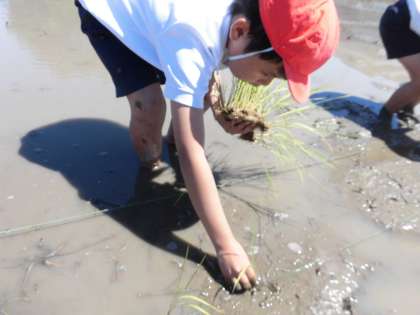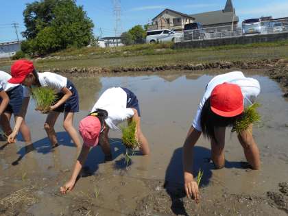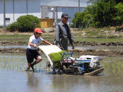 それから、各クラス二人ずつ、機械での田植え体験をしました。機械を操縦するのは大変だったようですが、頑張りました。手植え、機械どちらもとても貴重な体験をさせてもらいました。
