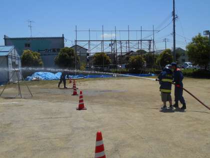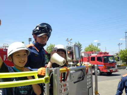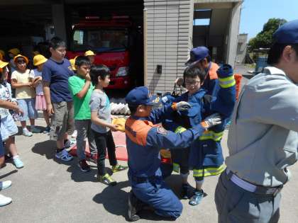 防火服を着て放水体験とはしご車体験の様子です。防火服はとても重く子どもたちはヨタヨタと歩いていました。また,はしご車体験では消防署より高いところまで上げてくださったので,みんな大興奮していました。