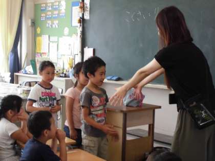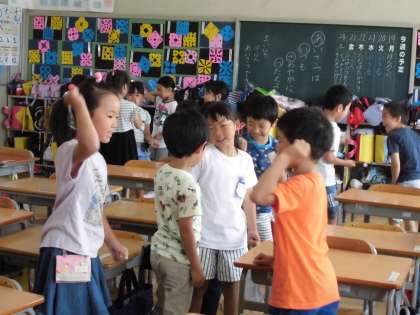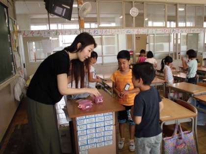 英語で自己紹介をしました。おはじきゲームであいさつの練習をしました。