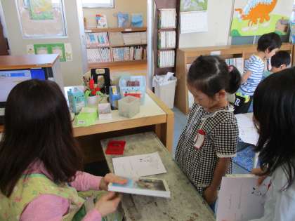 先週、「ほんのくに」で,ほんの借り方をおしえてもらい,そのときに借りた本を,今日ほんの返し方を教えてもらいながら返しました。