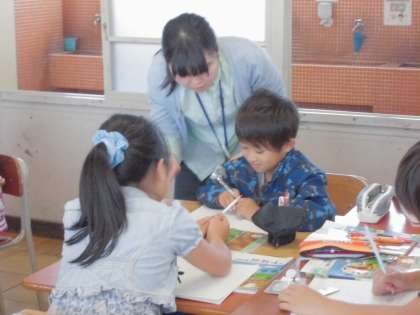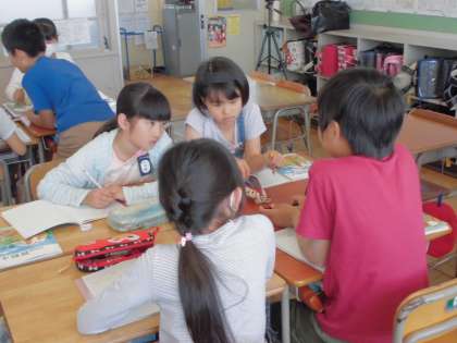 今日は実習生の先生による算数の授業がありました。まとめて何倍になるかを考えて問題を解く方法について学びました。グループの仲間と一生懸命考える姿が見られました。