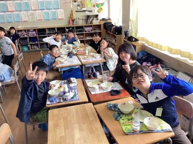 理科の授業で関節の大切さを体験しながら、給食を食べました。道徳では、今大切だと思...