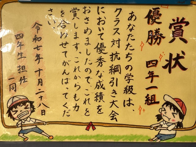 学年体育では、クラス対抗の綱引きを行いました。とても盛り上がり、思い出に残る、良...
