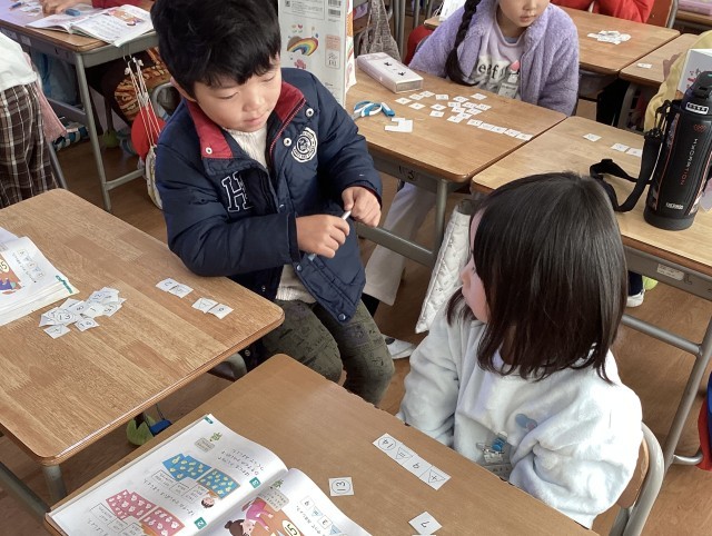 算数科「ひき算」の授業です。カードを使って、ペアでたし算やひき算の問題を出し合...