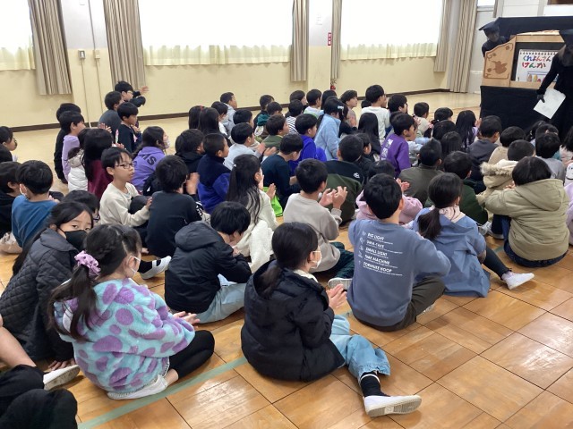 昼休みに大型紙芝居がありました。楽しみながら紙芝居を見ていました。