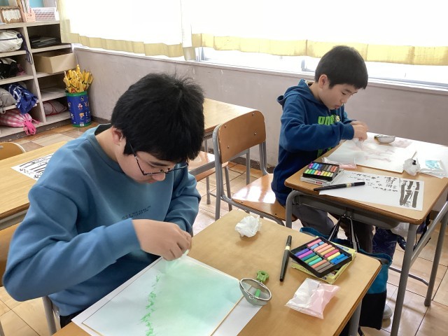 図工で水墨画に挑戦しました。今回は、筆や割り箸、段ボールやストローなど、様々な道...