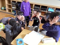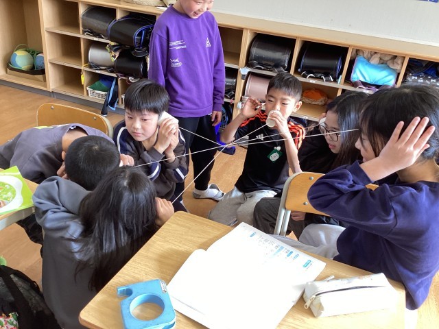 理科では音の性質を勉強しています。糸電話を作って実験しました。人数を増やしても声...