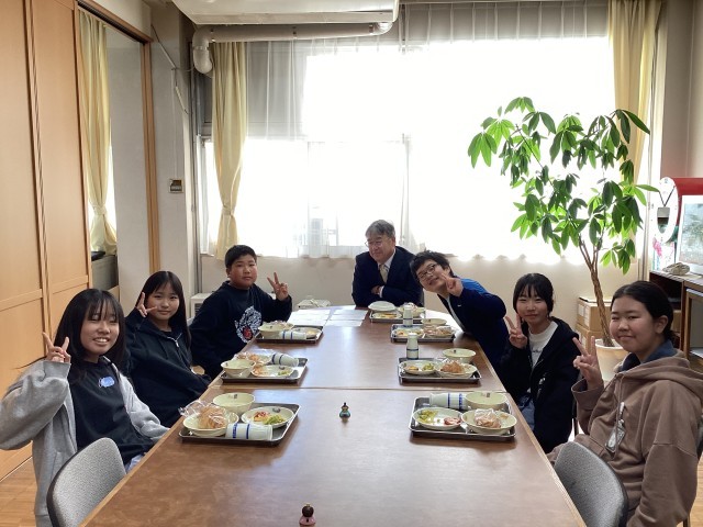 6−1の子どもたちが校長先生と一緒に給食を食べました。少し緊張した様子でしたが、...