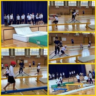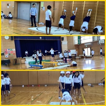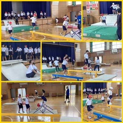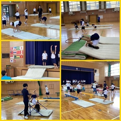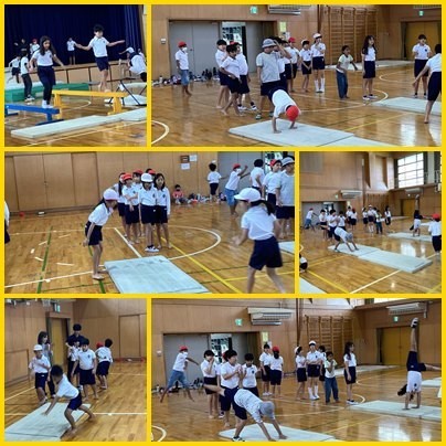 今日は2学期はじめてのイマ―ジョン体育の日でした。久しぶりにアンディ先生と会った子どもたちは大喜びでした。英語を使ってマットの技の名前を覚えたり、基本技を練習したりしました。その後は、サーキット形式でマットや平均台、鉄棒といったコースを自分たちで場を選択しながらぐるぐると回り、楽しく活動することができました。