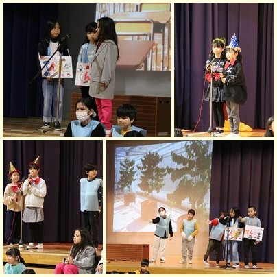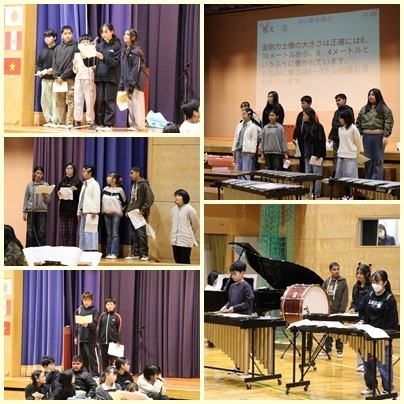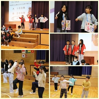 今日は3年生と6年生が東っ子発表会を行いました。3年生は校外学習で学んだ山車のことや石塚ガラス工場、消防署などで学んだことをクイズ形式で出題して発表しました。最後のダンスは、みんな楽しく1人1人がダイナミックに踊って会場が盛り上がりました。6年生は修学旅行で学んだ京都・奈良の文化やリトルワールドで学んだ世界の国の文化をグループごとに発表しました。最後の合奏は小さな世界をいろいろな楽器を使って演奏し、素敵な音色が会場に響き渡りました。