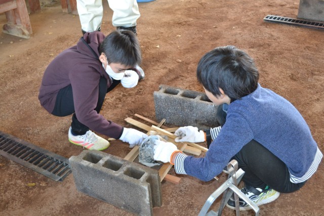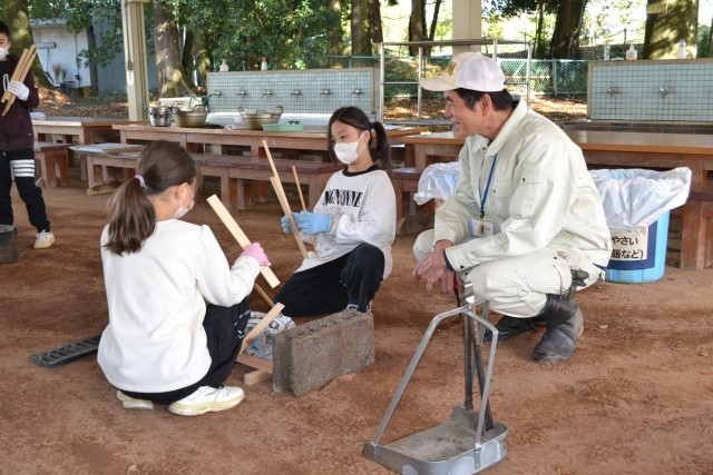 施設の方の話を聞きながら、薪を組んでかまどを作りました。
