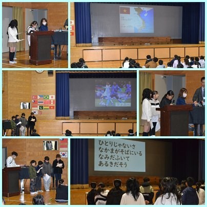 月曜日の朝会では、はじめに夏休みに応募した赤い羽根コンクールのポスターと国際平和ポスターで入選した児童の表彰を行いました。続いて、給食委員会と環境委員会の児童からベトナムのあいさつや文化についての紹介がありました。月曜日からスタートしたベトナムウィークは2週間続きます。最後に、人権の歌「また明日ね」を全校で歌いました。また人権についてもみんなで考えていきましょう。