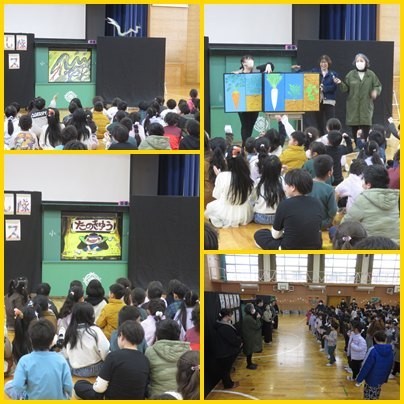 今日は給食後の昼休みの時間に、全校児童が体育館に集合して、読み聞かせのアリスの会が実施する大型紙芝居を鑑賞しました。「たのきゅう」と言うとても面白いお話を鑑賞しました。途中で、大蛇ウワバミの動く人形も登場し、とても盛り上がりました。工夫を凝らした発表をしてくださったアリスの会の皆様、ありがとうございました。