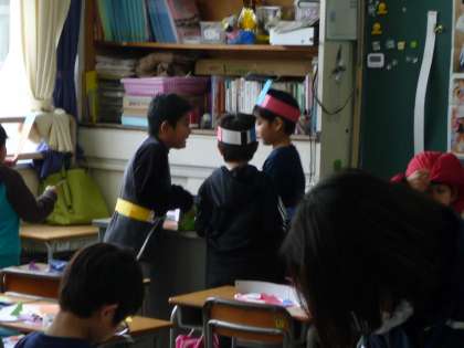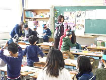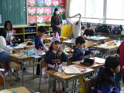 2年生が図画工作で「わっかでへんしん」というわっかを使った工作をしていました。