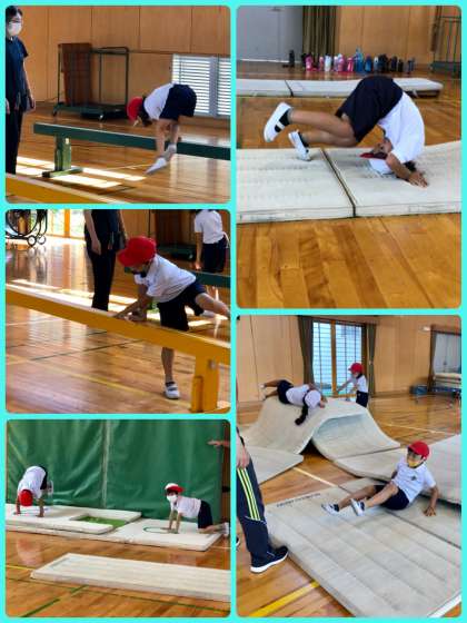 トーマス先生のイマージョン体育を行いました。back roll後転とfront roll openlegs開脚前転に挑戦しました。きれいに回る方法を教わり挑戦しました。