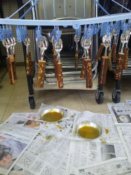 スプーンができあがりました。ニスが乾くまで干しておきます。