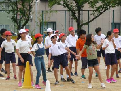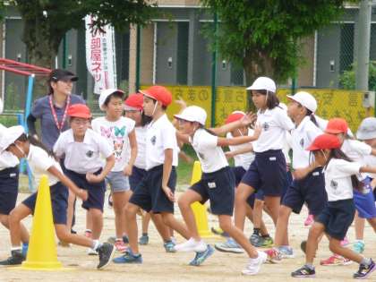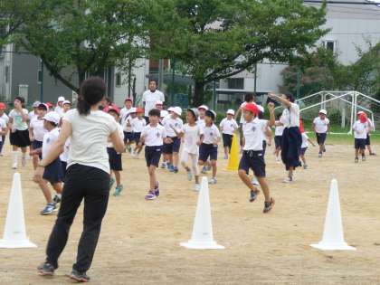 運動場での場所、移動、立ち方座り方などの確認をしました。