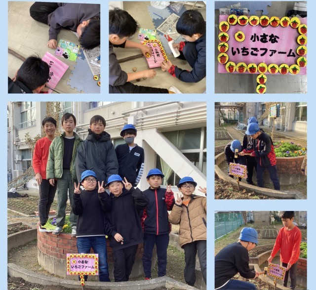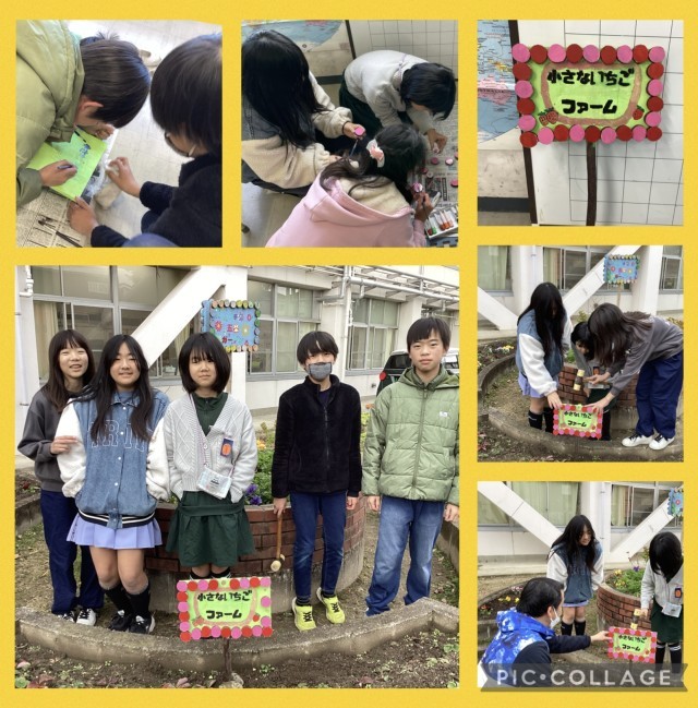 地域の方にご協力していただき、環境美化委員花チームのみんなで廃材を利用した立て札を一緒に作成しました。いちご畑の名前をみんなで考え、心を込めて色を塗り協力して完成させました。春になり甘くて美味しいいちごが実りますように。