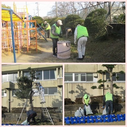 多くの方のご協力で、運動場東側フェンス沿いの樹木や体育館横の高木の剪定を中心に活動してくださいました。