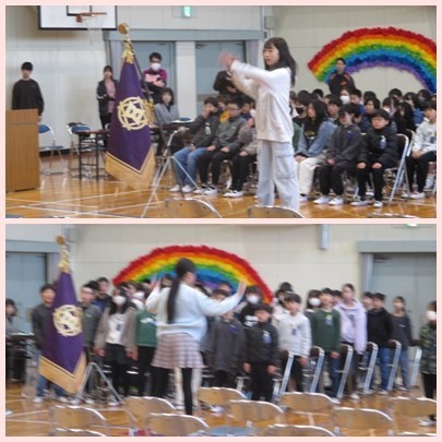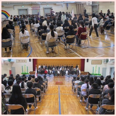 1、2時間目に卒業式の予行練習を行いました。式の流れを確認することと、式中の卒業生と在校生の歌や呼びかけによる「別れの言葉」、入退場、式中の注意などの確認をしました。