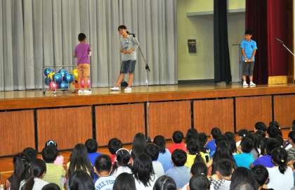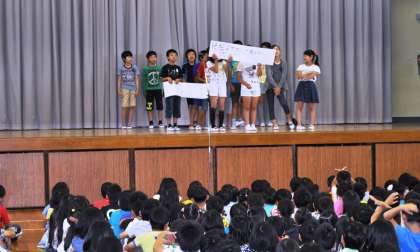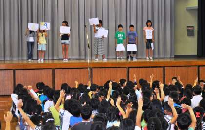 先週に引き続き、朝の児童集会で委員会紹介を行いました。図書委員会は、図書館の使い方を伝えました。運動委員会は、ボールや一輪車、竹馬などの道具の借り方・返し方を寸劇で伝えました。飼育栽培委員会は、花壇や観察池、鳥小屋での注意事項をクイズ形式で伝えました。生活委員会は、窓の戸締まりについて注意を促しました。五条川小学校のみんながルールを守り、気持ちよく生活していけるといいですね。