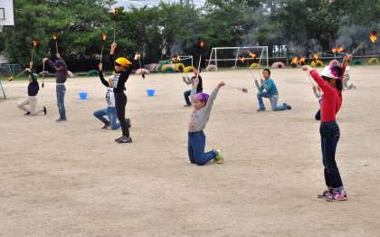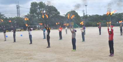27日、28日の野外活動に向けて、5年生は着々と準備を進めています。1ヶ月前から、キャンプファイヤーの火の舞(トワリング)の練習を長放課などを使って続けてきました。今日は、下校後に残って、実際に火をつけてトワリングの練習を行いました。保護者の方々にも見ていただく中で、見事に演じきりました。本番では、暗い中での演技です。安全に十分注意して、素敵な演技を披露してほしいものです。