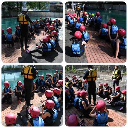 プールサイドでウェットスーツやヘルメットを装着し、カヌー体験開始です。