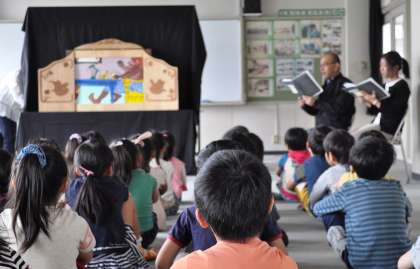 今朝は、多目的ルームで1年生の読み聞かせでした。1つ目の話は「ジャックと豆の木」。子供達は、大型紙芝居を見ながら、先生たちと読み聞かせボランティアの人たちの言うせりふや、効果音を聞きながら、お話を楽しみました。2つ目の話は「はらぺこあおむし」。大型絵本を見せながらのボランティアの方達のリズムよい読み聞かせに、子供達は見入って、聞き入っていました。1年生が、これから多くの本に触れていくきっかけになるとよいと思います。