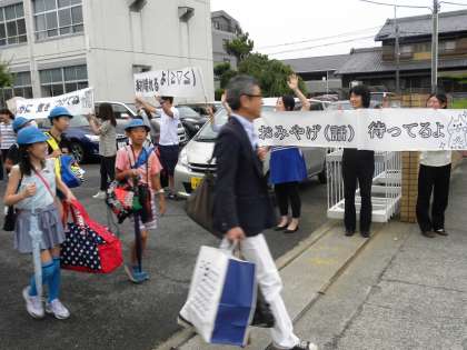 出発式後、荷物を持ってバスに乗車です。見送りの先生たちも横断幕で修学旅行の成功を応援します。