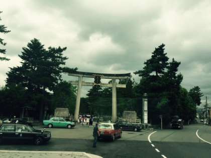 西陣織会館へ向かう途中バスから北野天満宮が見えました。みんなかしこくなれるよう通り過ぎる一瞬に願いを込めました。