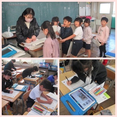 2組は紹介したい学校の生き物やものなどを絵や文章にまとめます。金魚のゆうかや金色のコイが人気です。