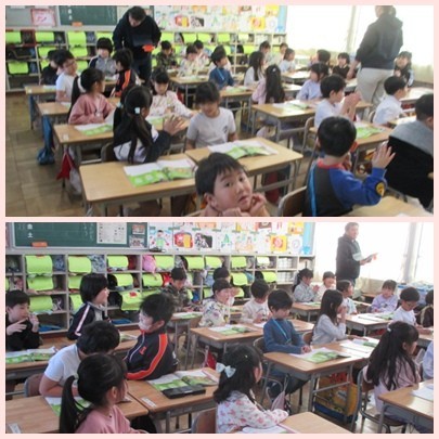 今日の「まあち」さんによる読み聞かせは1年生でした。1つ目のお話は「どうぶつ句会」(あべ弘士:作)です。お正月にちなんだ俳句を登場する動物たちが読みます。鬼頭先生も参加してくれました。俳句の場面では、思わず口ずさんでしまう子どもたち。本の世界にひたっていました。
