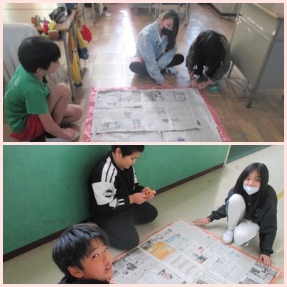 4年生の算数の様子です。「1㎡ってどのくらいの大きさ・広さか」をタフロープや新聞紙などを使って考えます。