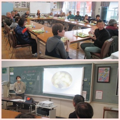 栄養教諭が、給食の今昔、メニューの工夫、調理の様子などを動画や資料をもとに紹介したり、給食の思い出を語り合ったり、和やかな時間となりました。
