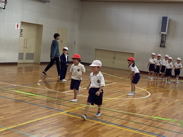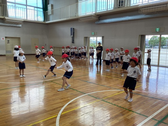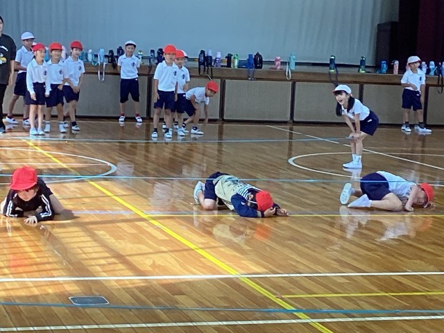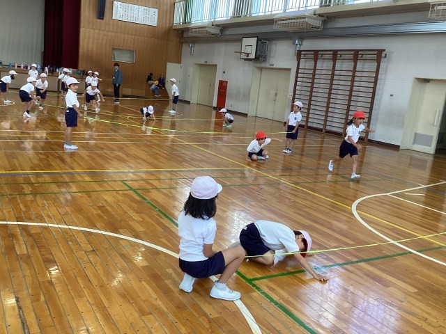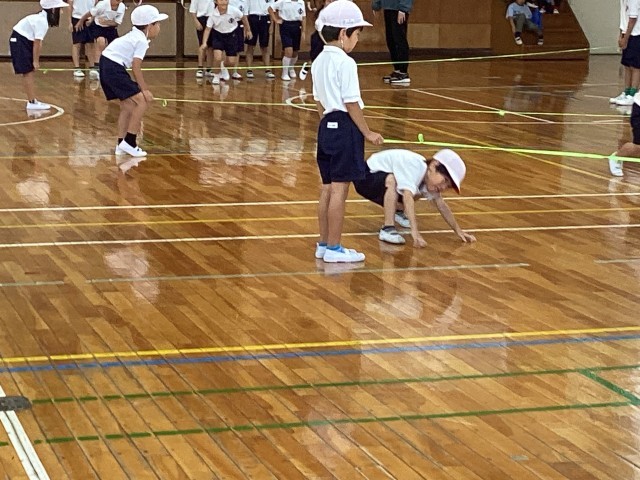 1年生の学年体育の様子です。体育館でカラフルな金を使い、くぐったり飛んだり楽しい時間を過ごしました。