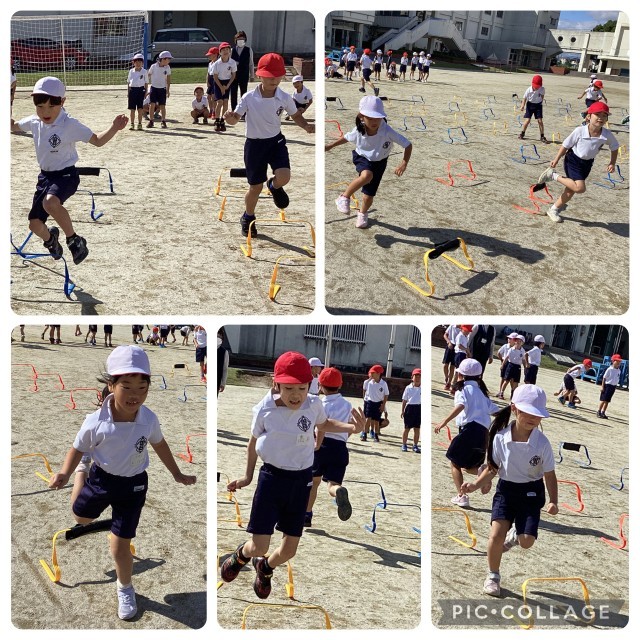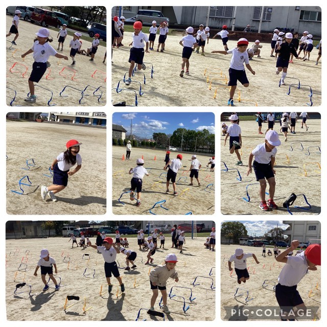 体育では、ミニハードルを使ってジャンプあそびをしました。