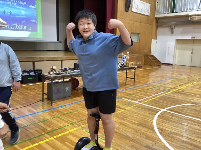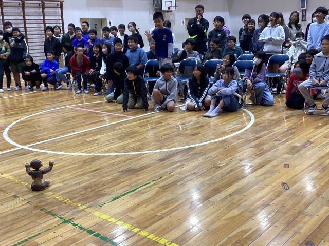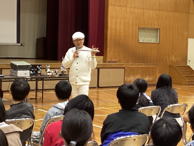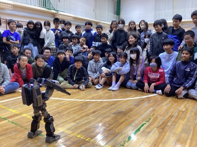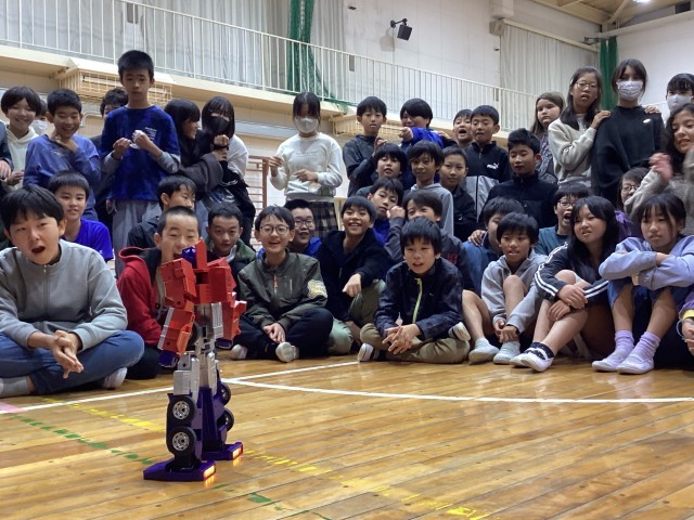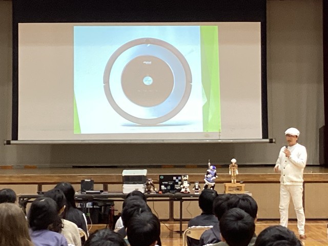 西山禎泰先生をお招きし、ロボットの歴史や持続可能な社会にするために活躍しているロボットなどについて教えて頂きました。戦車から二足歩行に変化するロボットを見てびっくり!!未来について考える時間になりました。