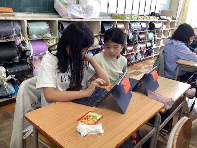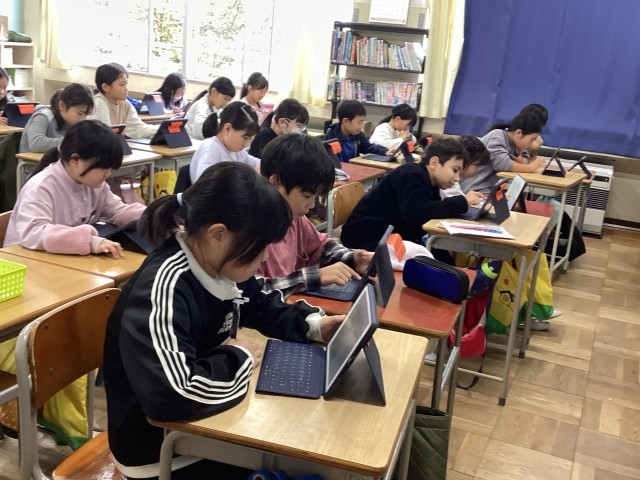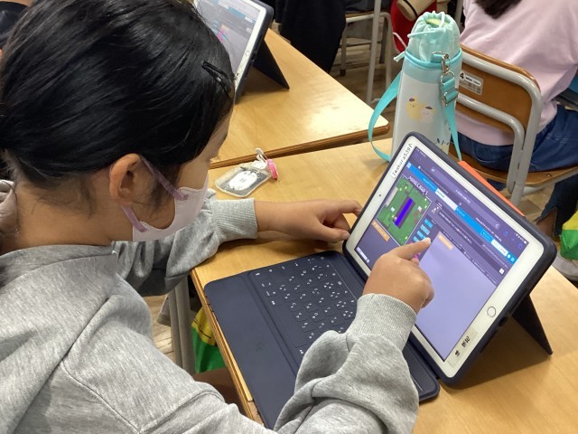 ICT支援員さんに教えていただきながら、プログラミング学習をしました。マインクラフトのキャラクターもスクラッチでプログラミングしながら、前後左右に動かして楽しんでいました。