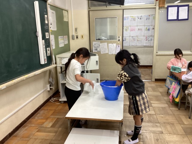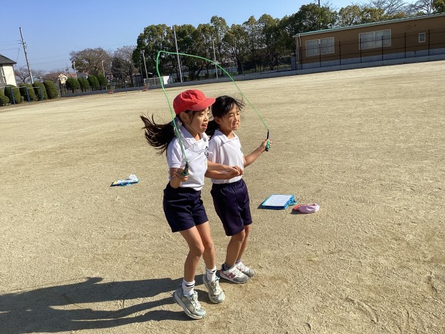 縄跳びの練習をしました。二人で息を合わせて跳んでいました。