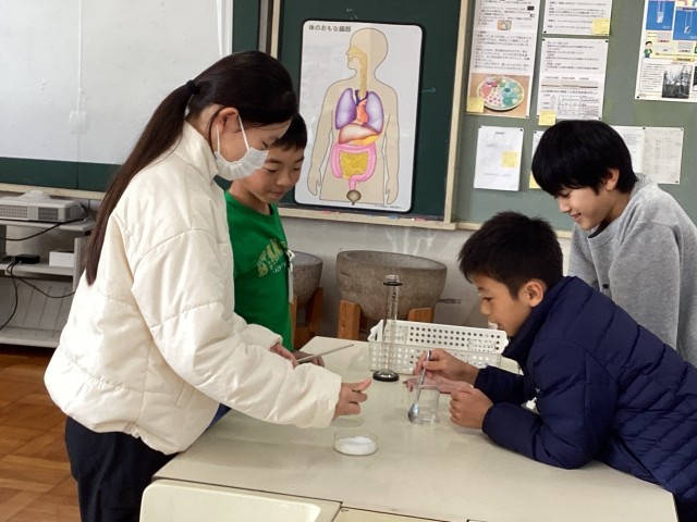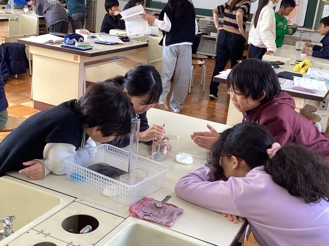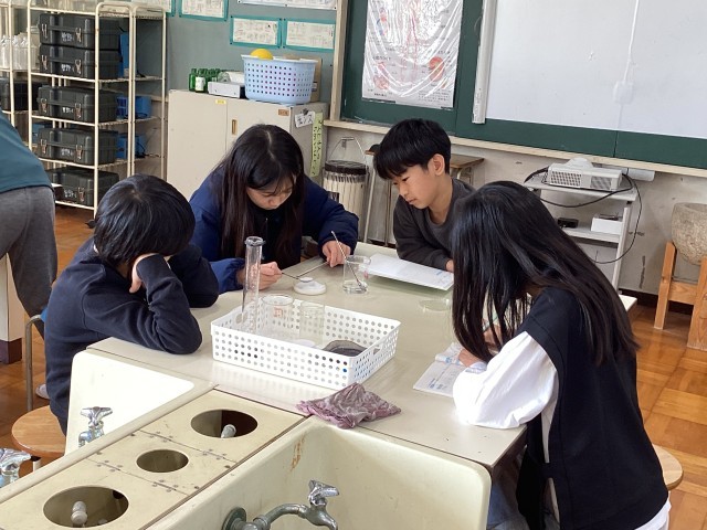 理科の授業で、物質の溶ける様子を観察しました。50ミリリットルの水に塩が何グラム溶けていくか、予想を立てて実験をしました。塩が溶けなくなる状態を見極めるのが大変です。