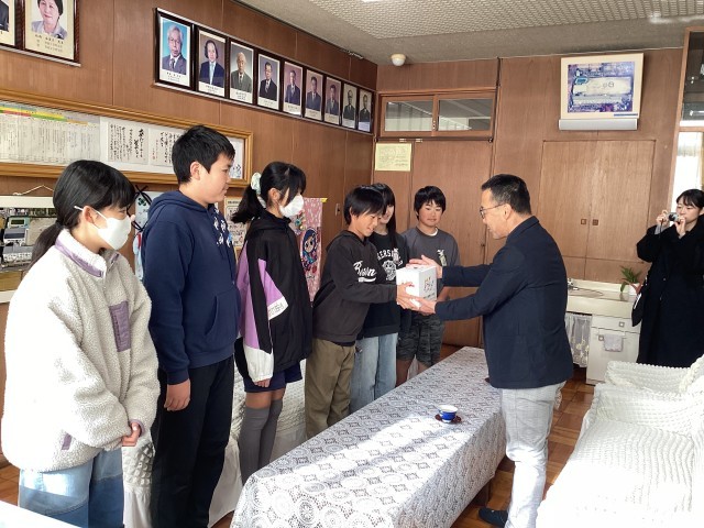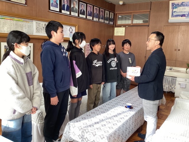 12月5日(金)の昼放課に社会福祉協議会の係の人に来校いただき、赤い羽根共同募金を託しました。募金は、この後、高齢者や障害をもつ人のために役立てられます。また、地域福祉事業にも使われ、やさしい街づくりにも役立てられます。