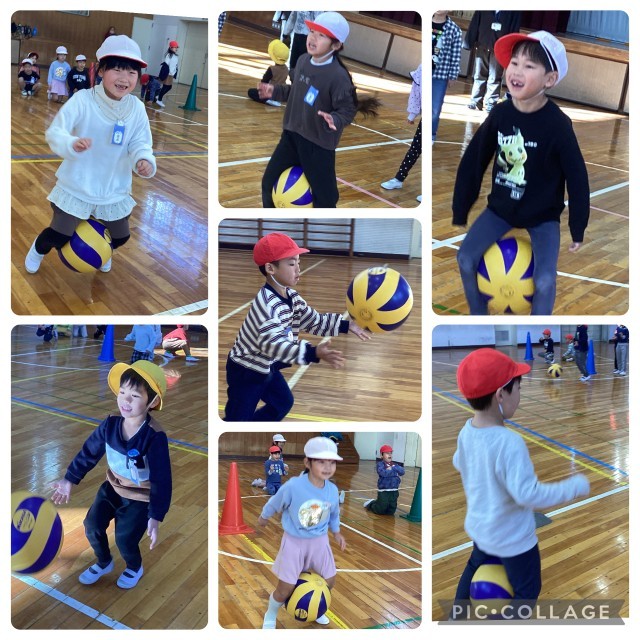 1・2組合同で、ボールを使った運動遊びをしました。