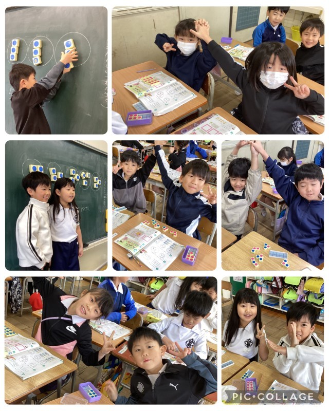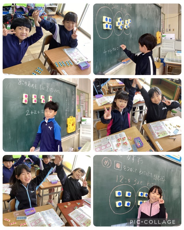 ブロック操作を通して、同じ数ずつ分けたり、何人かに等分したりする分け方を学びました。