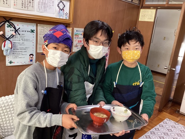ご飯と味噌汁の調理実習を行いました。米作りから関わったお米を使い、鍋で炊いたご飯はモチモチで、とびっきりおいしかったです。味噌汁は、煮干しの出汁の味がよく効いていて、大根、揚げ、ネギの具の切り方も揃っていて、見た目も楽しめる味噌汁になりました。ごちそうさまでした。