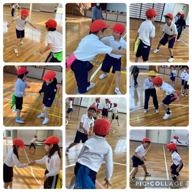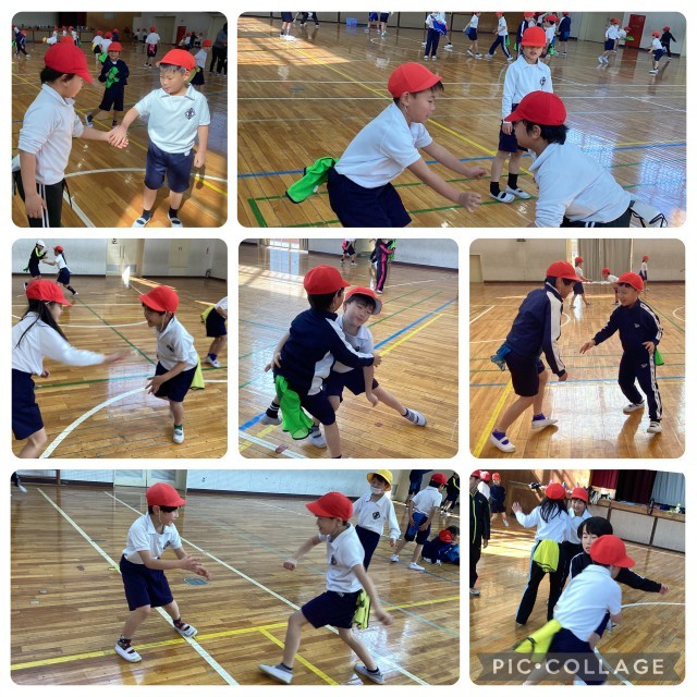 体育では、鬼ごっこやしっぽとりをして遊びました。