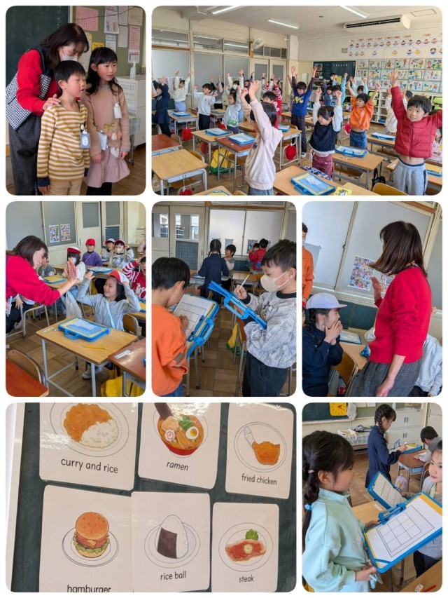 食べ物の名前を英語で言うと、「ピッザ」「ハンバガー」などなど。先生の発音を上手に真似ていました。