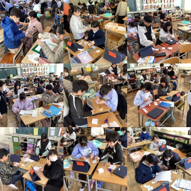 算数の授業では、直方体と立方体の箱づくりをグループで協力して作りました。展開図を考えるのが大変でした。