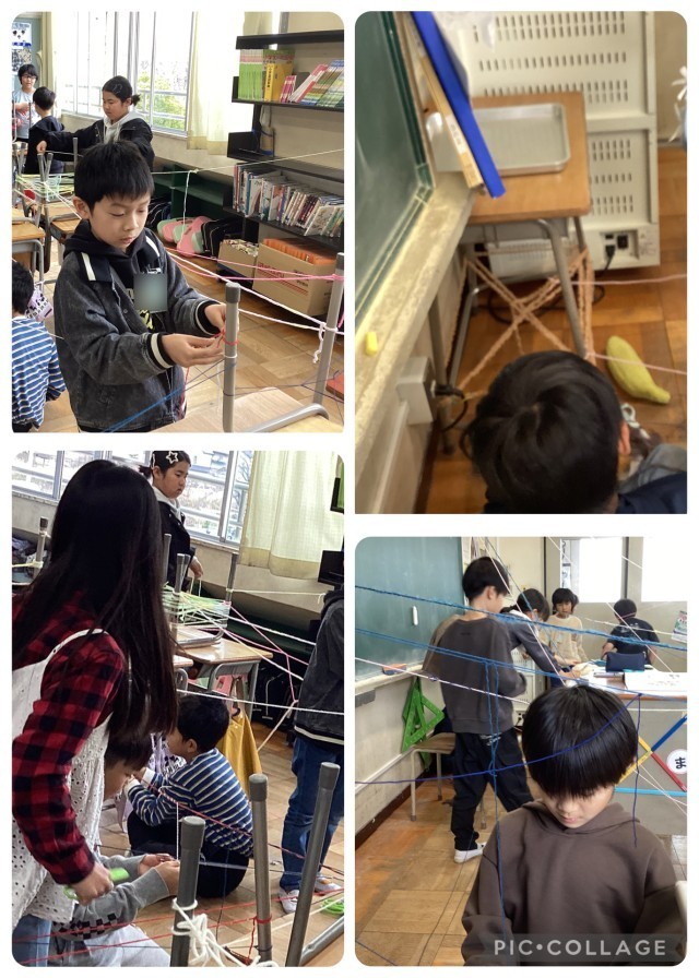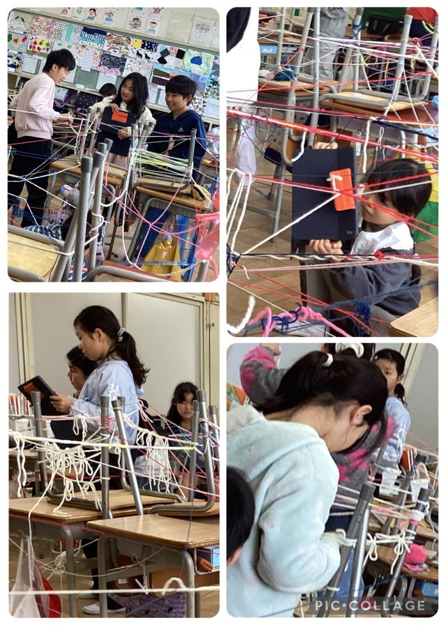 図工で「ひもでつないで」の単元の勉強をしました。教室中を糸でいっぱいにして、お気に入りの場所探しをして楽しみました。
