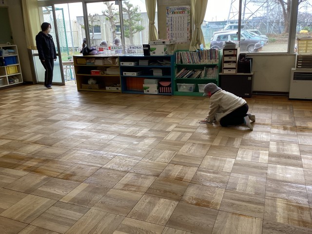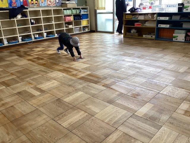 ほうきでゴミをはいて、床を水拭きして、ワックスがけの準備をしました。